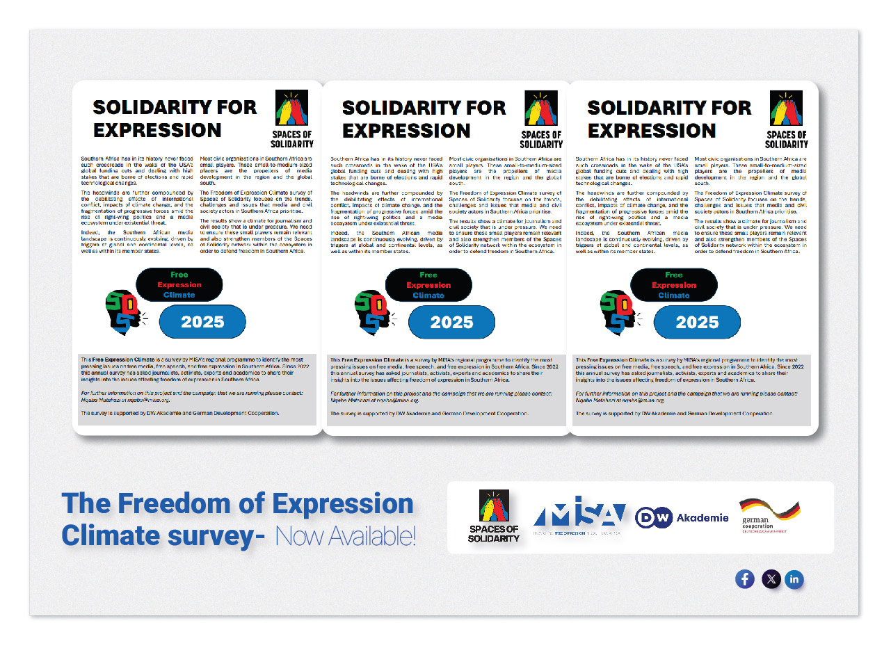 The Freedom of Expression Climate survey of Spaces of Solidarity focuses on the trends, challenges and issues that media and civil society actors in Southern Africa prioritise.